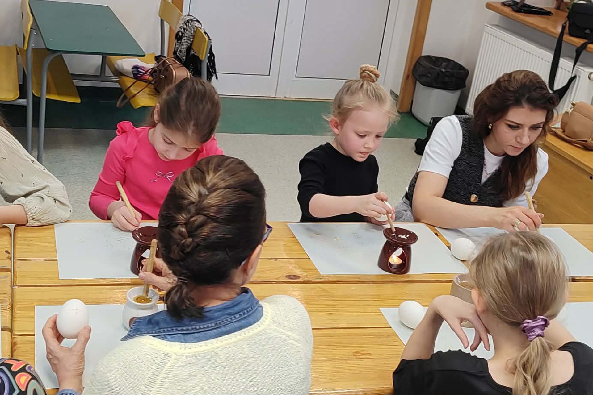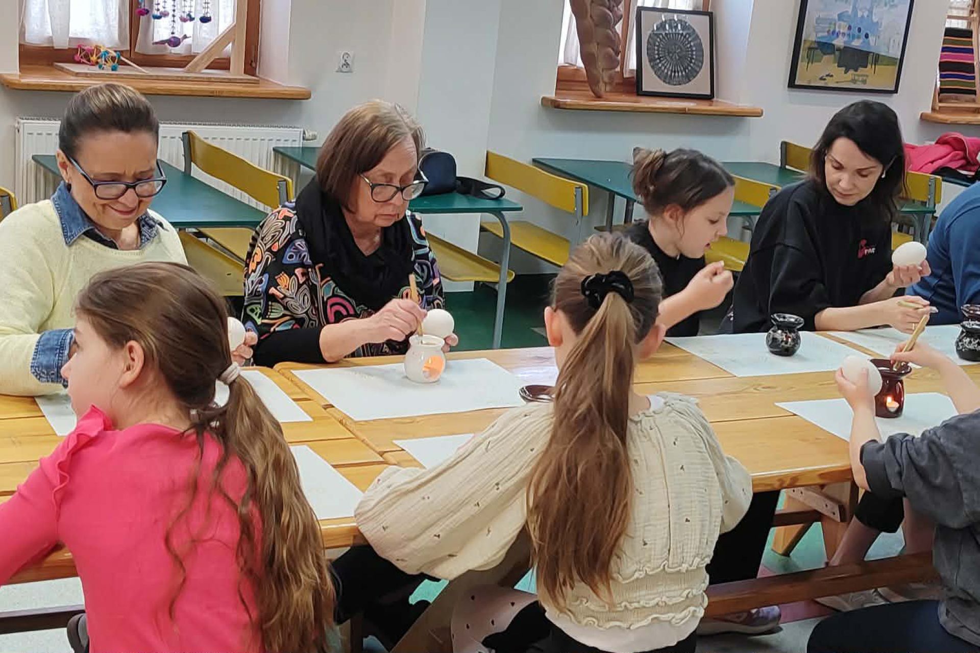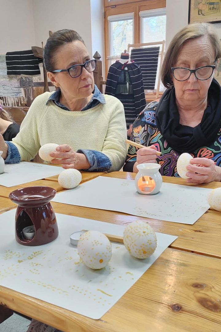 Najważniejszą częścią spotkania była oczywiście część praktyczna. Każdy z uczestników samodzielnie wykonał dwie pisanki, poznając kolejne etapy tradycyjnego procesu zdobienia. Powstały niepowtarzalne, barwne wzory inspirowane dawną sztuką ludową.