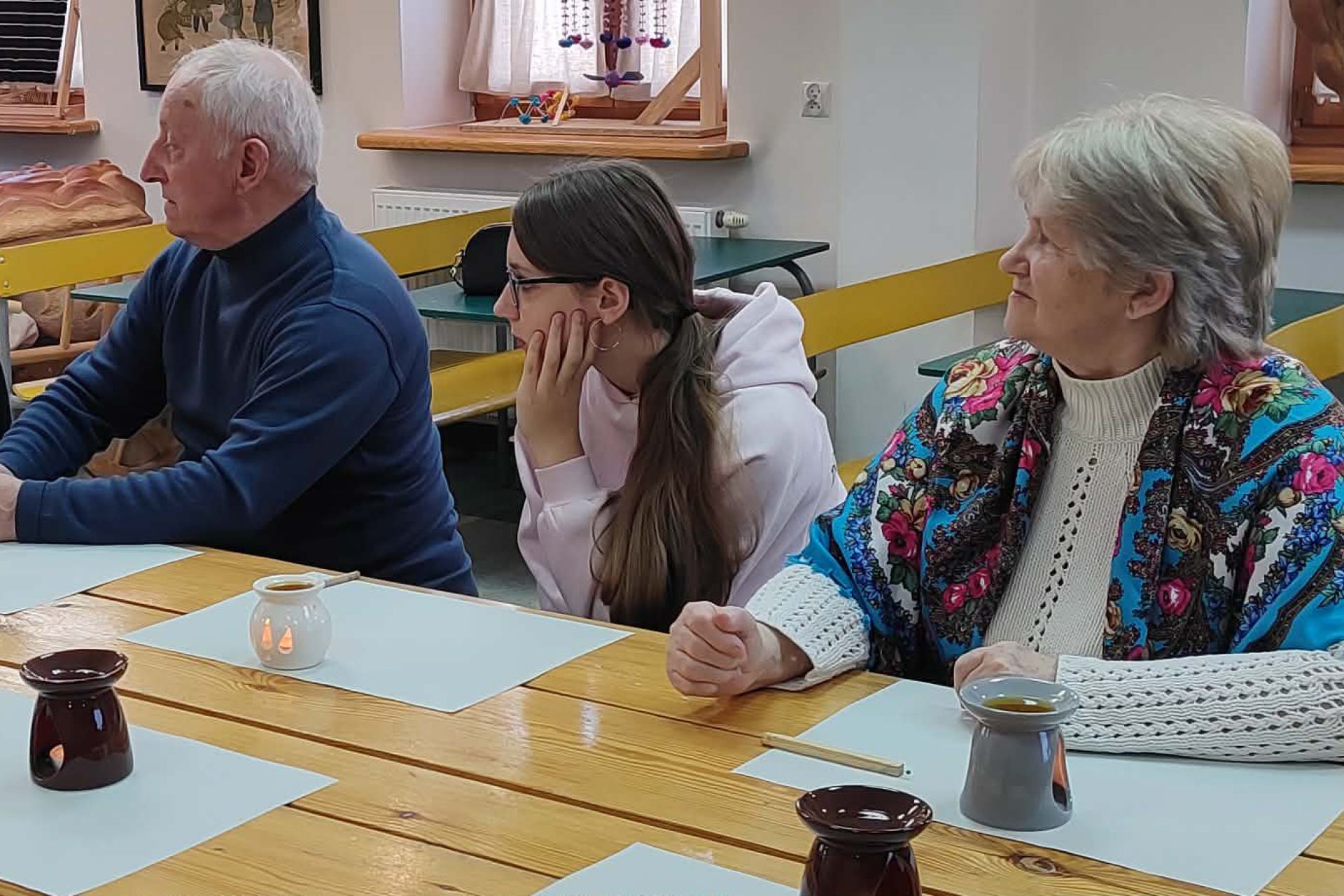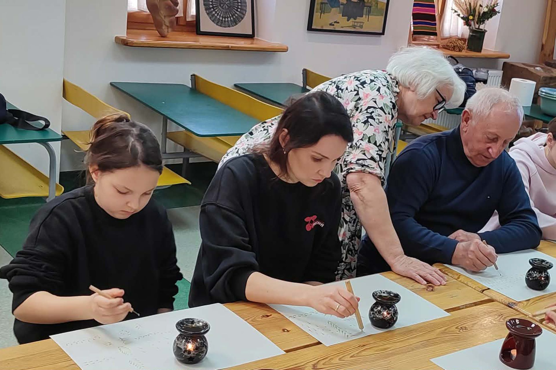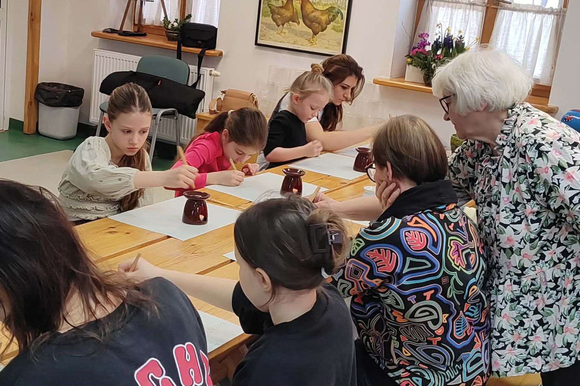 Najważniejszą częścią spotkania była oczywiście część praktyczna. Każdy z uczestników samodzielnie wykonał dwie pisanki, poznając kolejne etapy tradycyjnego procesu zdobienia. Powstały niepowtarzalne, barwne wzory inspirowane dawną sztuką ludową.
