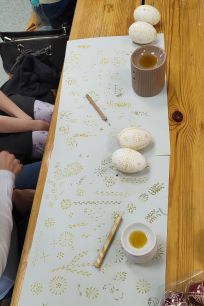 Podczas warsztatów uczestnicy poznali historię oraz znaczenie pisanek – jednego z najbardziej rozpoznawalnych symboli Wielkanocy. Prowadząca zajęcia twórczyni ludowa Maria Ostrowska opowiedziała o technice batikowej, która od pokoleń była najczęściej stosowana w regionie radomskim. Uczestnicy mogli zobaczyć, jak przy pomocy rozgrzanego wosku nanosi się wzory na skorupce jajka, a następnie jak barwi się je naturalnymi barwnikami, aby po usunięciu wosku odsłonić charakterystyczny jasny wzór na kolorowym tle.