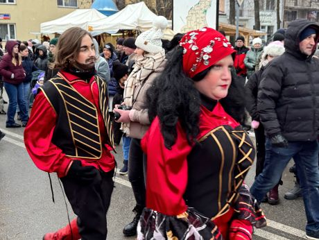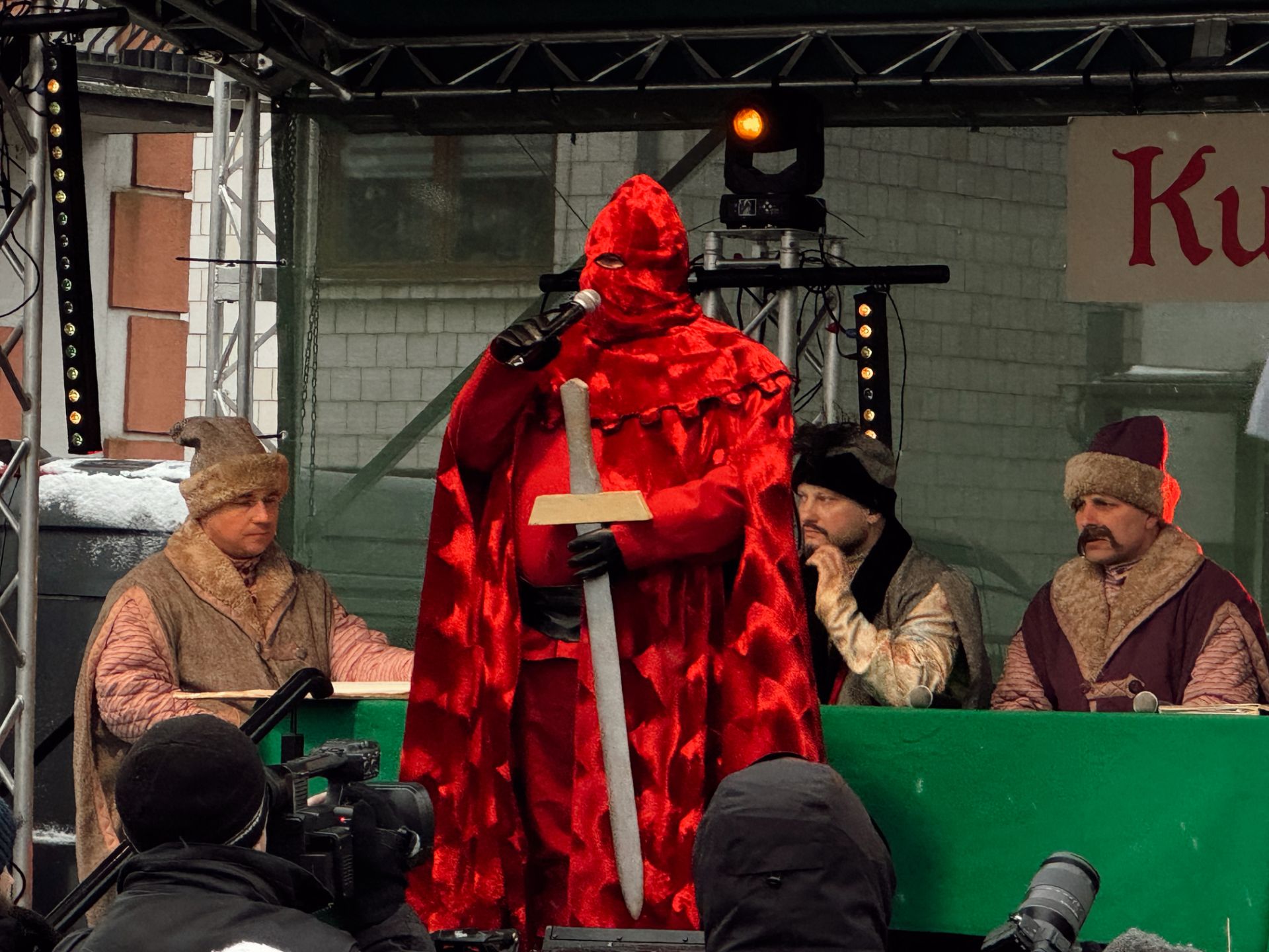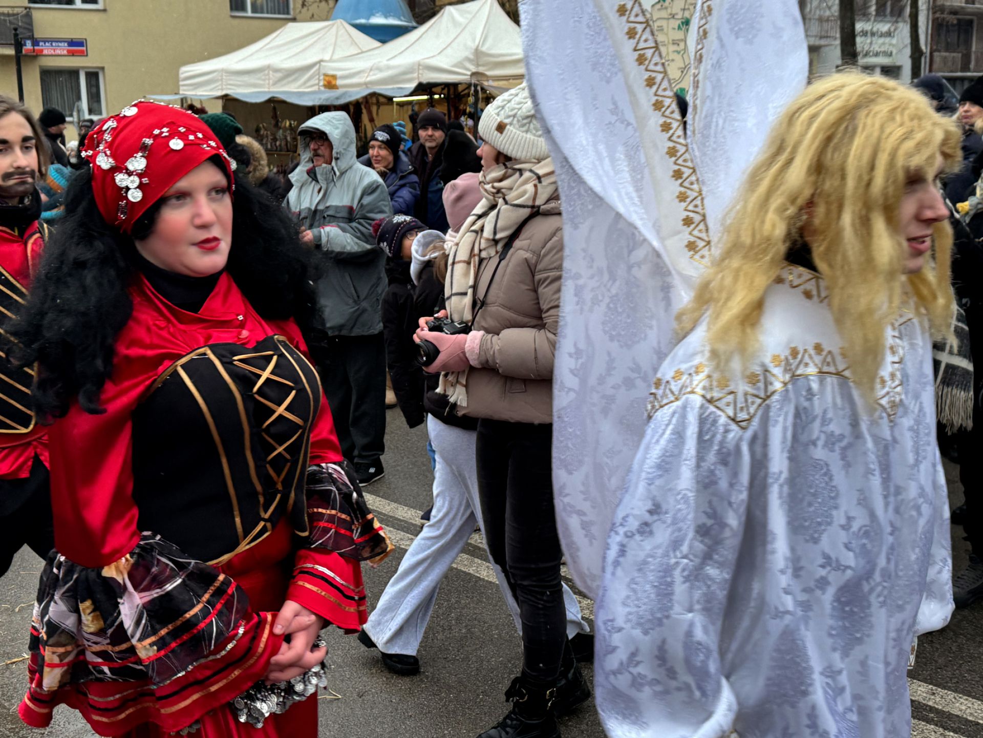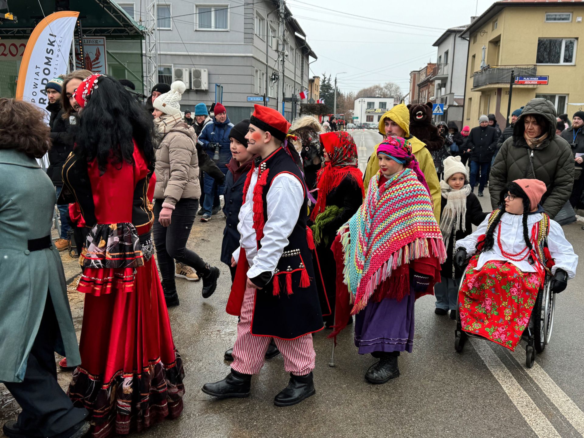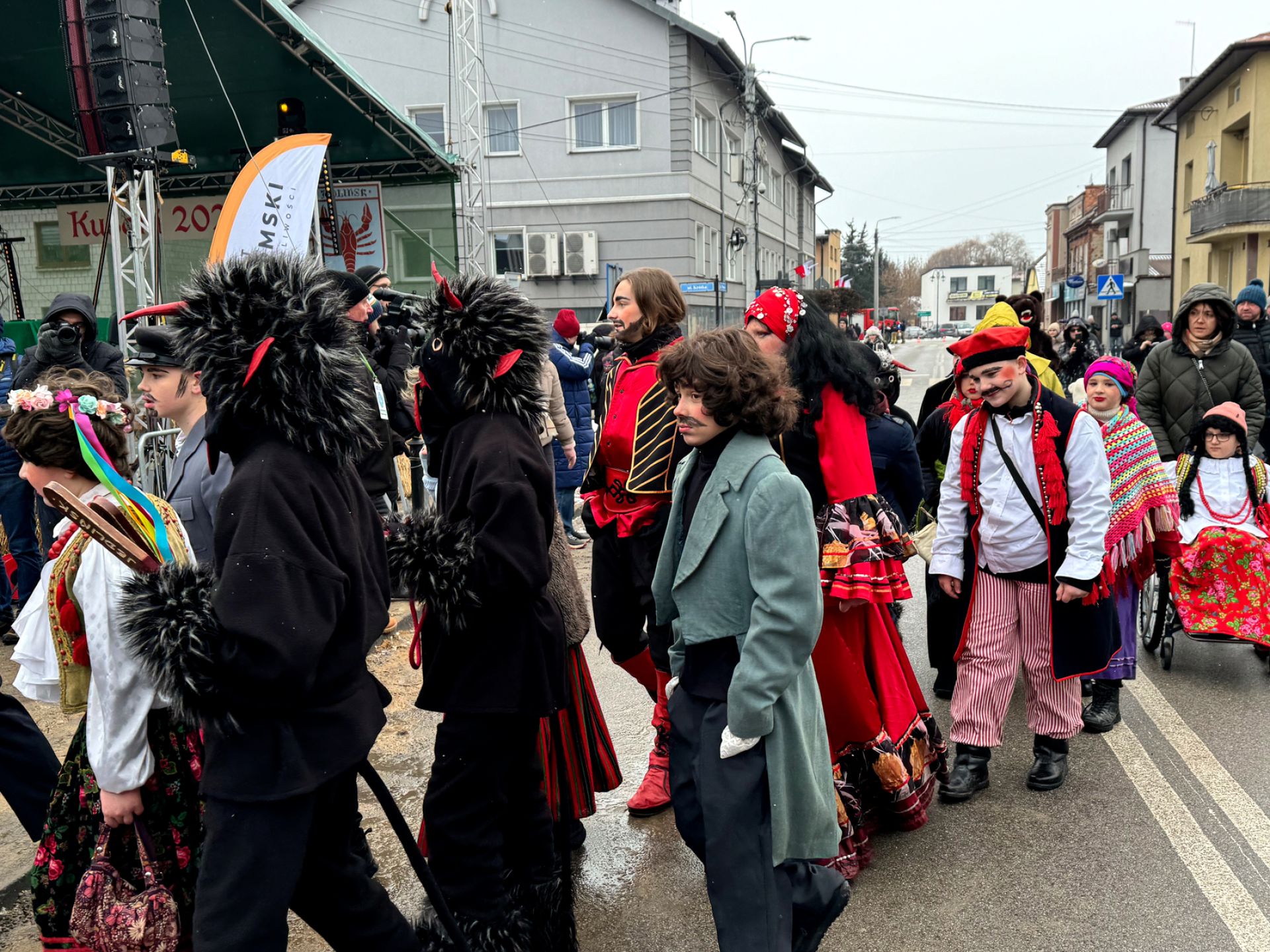 Tuż przed godziną 16 w stronę Rynku w akompaniamencie radosnej muzyki młodzieżowej orkiestry dętej gminy Jedlińsk wyrusza korowód, który prowadzą postacie z widowiska: Kat, Wójt, Sędzia i ławnicy, tuż za nimi pozostałe „kusaki”. Od kilku lat towarzyszy im również postać raka – elementu herbu Jedlińska. Przebrania karnawałowe to kostiumy, które pozwalają na stworzenie odmiennego wizerunku. Tradycyjnie dawały one sposobność na odgonienie strachu przed nieznanym ale i symbolizowały chaos i odwrotność znanej ludziom codzienności. Postać diabła przywołuje skojarzenie z kuszeniem, grzechem, pokazuje zło w oswojonej formie. Śmierć nie tylko jest wspomnieniem zbrodniarzy ale również przypomnieniem o końcu zabawy i nadchodzącym Wielkim Poście. Postaci „obcych” – Cyganie, Turkowie, Kozacy, Żydzi to elementy „świata na opak” czyli tego co w dawnych czasach na wsi było nieznane, tajemnicze a przez to wzbudzające strach i często przedstawiane w sposób wręcz przerysowany. Przebrania policjantów to parodia władzy, porządku i satyra na autorytety, na którą podczas zapustów było przyzwolenie. Równie znaczące było odgrywanie kobiecych ról przez mężczyzn - „baby” wyzwalały efekt komiczny, żartobliwy i wpisywały się w przewrotny charakter zapustów.
