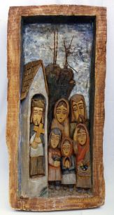 Płaskorzeźba w drewnie: Stanisław Piwoński, „Ze święconym do kościoła” ze zbiorów Muzeum Wsi Radomskiej