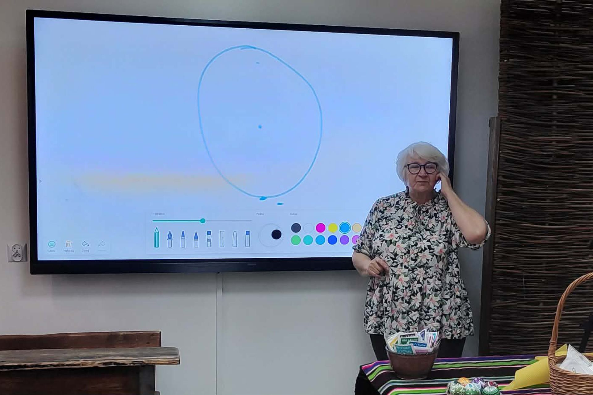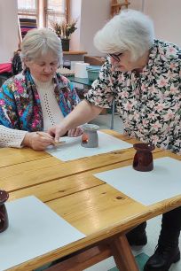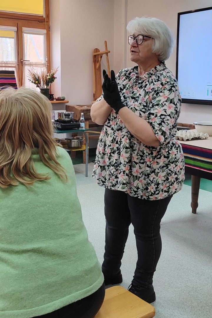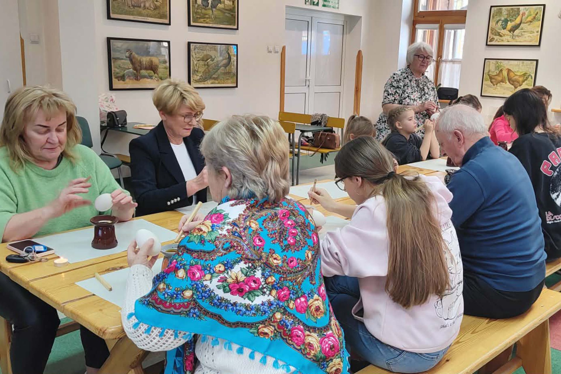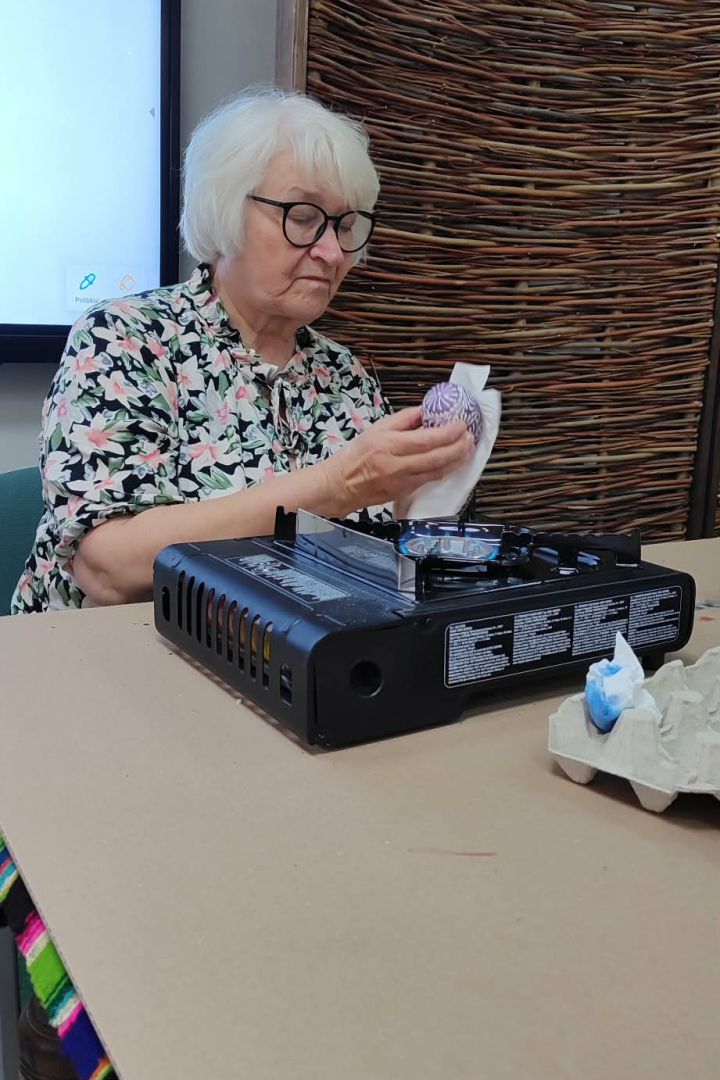 Najważniejszą częścią spotkania była oczywiście część praktyczna. Każdy z uczestników samodzielnie wykonał dwie pisanki, poznając kolejne etapy tradycyjnego procesu zdobienia. Powstały niepowtarzalne, barwne wzory inspirowane dawną sztuką ludową.